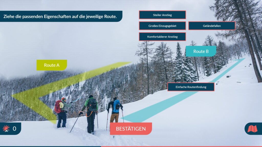 Unsere Trainings wurden gemeinsam mit erfahrenen Bergführern, Spiele-Entwicklern und E-Learning-Profis entwickelt. Du bekommst direktes Feedback zu deinen Entscheidungen und lernst so, dein Wissen in Stresssituationen zuverlässig anzuwenden.